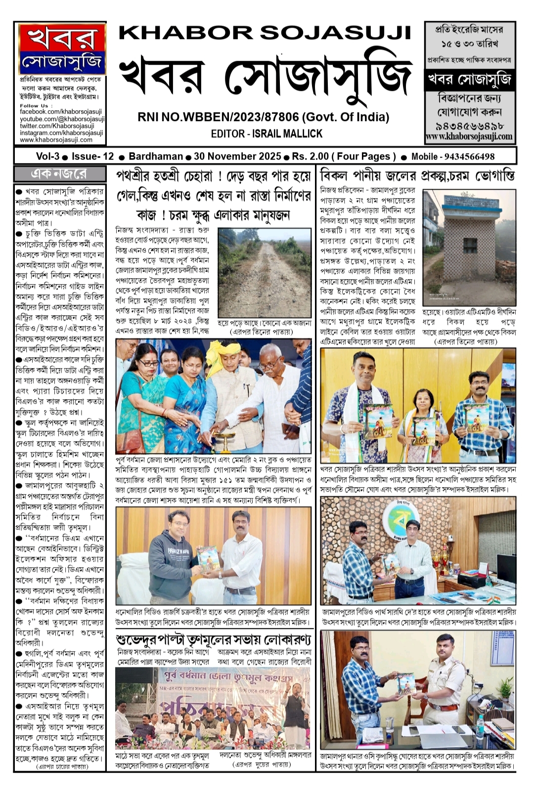 ১৫ দিনের বাছাই করা খবর নিয়ে আজ প্রকাশিত হল খবর সোজাসুজি পত্রিকার ১৫ নভেম্বর সংখ্যা(KHABOR SOJASUJI (VOL-3, ISSUE -12, NOVEMBER 30 , 2025)