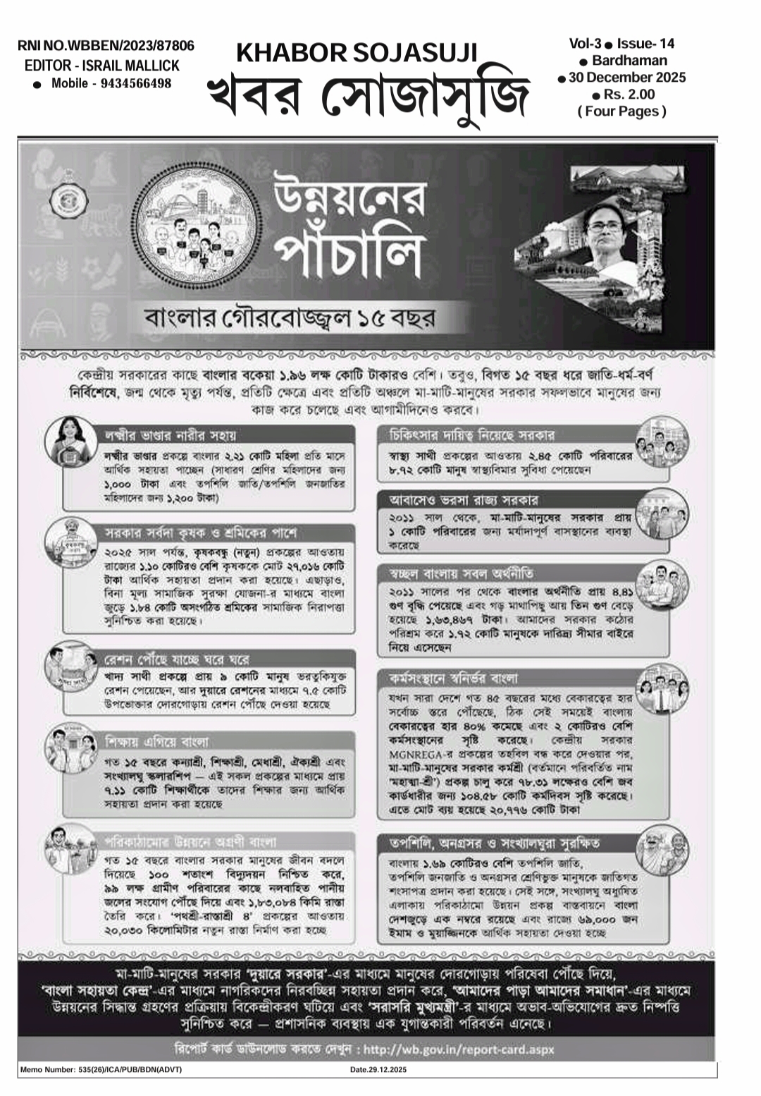 ১৫ দিনের বাছাই করা খবর নিয়ে আজ প্রকাশিত হল খবর সোজাসুজি পত্রিকার ৩০ ডিসেম্বর সংখ্যা(KHABOR SOJASUJI (VOL-3, ISSUE -14, DECEMBER 30 , 2025)