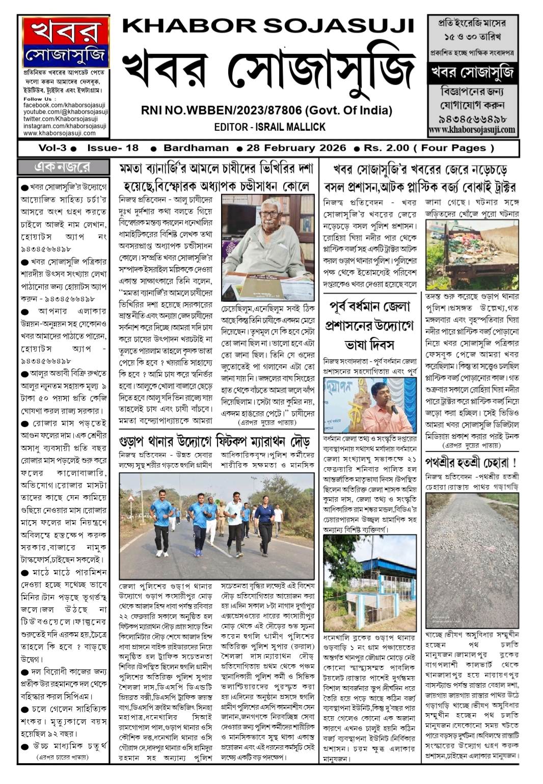 বাছাই করা খবর নিয়ে আজ প্রকাশিত হল খবর সোজাসুজি পত্রিকার ২৮ ফেব্রুয়ারি সংখ্যা(KHABOR SOJASUJI (VOL-3, ISSUE -18, FEBRUARY 28 , 2026)